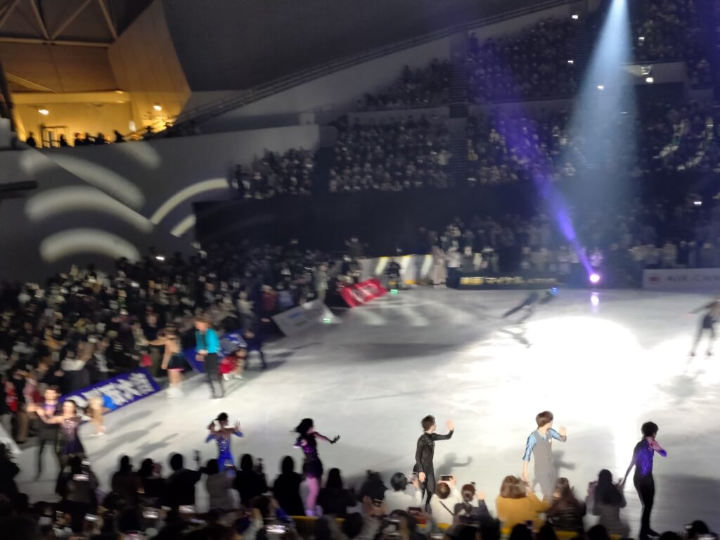 りくりゃうが終わるやいなや、すぐに人が飛び出してきます。そして次々と思い思いに滑ります。アリサ・リウとマリニンはファンサービスすごいですね。最前列の人とハイタッチしています。いいなあ〜。でも、最前列のチケットは私たちの2倍するので、そのぐらいはないとね。