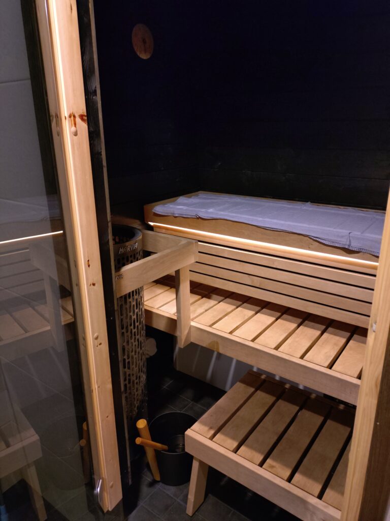 ホテルにサウナがついていました。30分サウナ室を暖めて、石に水をかけると蒸気が出て、サウナができます。