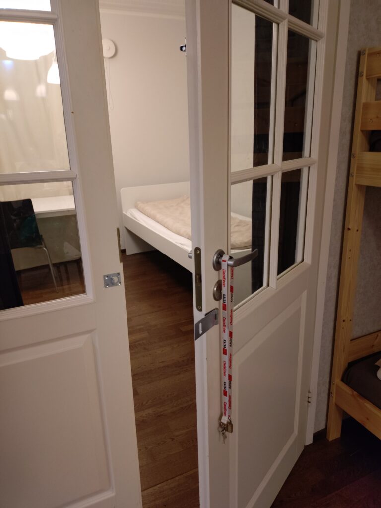 この寝室の窓は鍵がありません!しかも入口の隣の部屋なので、防犯上問題があります。したがって、窓の鍵のかわりに、寝室に鍵をかけて不審者防止するのではないか…と推理しました。これが一番平和な理由なので、これで決定です!(それより窓に鍵をつけろよーとも思いますが…)