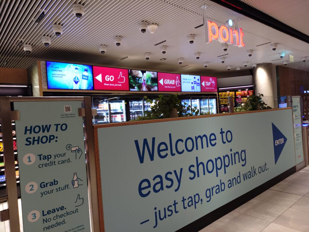 このお店には店員さんがいません、上を見るとカメラがたくさん。そう、このお店は入口でカードをタッチして、品物を取ってそのまま出たら、カードを請求がくるのです。初めて見たので、思わず写真を撮りました。ノルウェーは、モバイル進んでいます。