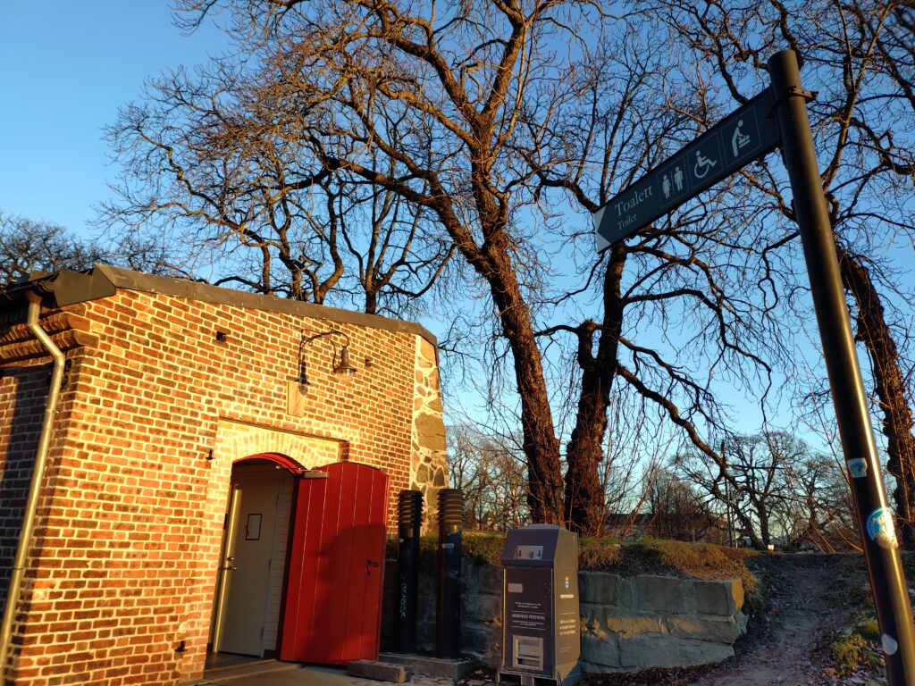 城塞もあって、城を守るための大砲もありました。また、QRコードがあって、読み込むと、このお城と城塞の説明が読めます。トイレは男女共用です。男性用トイレも個室です。