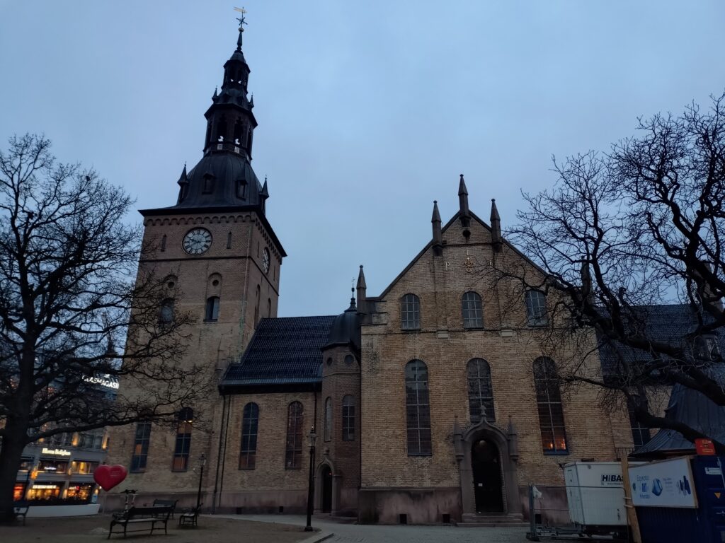 翌日の朝、まだ時間があったので、オスロ市内を散策しました。どこも閉まっていると思いきや、教会のドアが開いていて、人々が入っていきます。入ってみるとまもなくクリスマスのミサが始まるところでした。入った人はリーフレット。もらっていましたが、私はもらえなかったです。観光客はくれないんだ。少し眺めて、出ました。