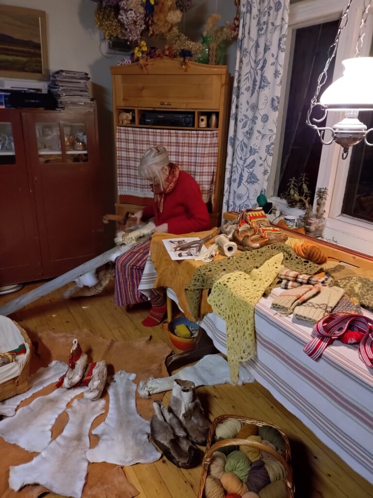 サーミの毛糸はカラフルですが、自然の植物で染めているそうです。トナカイの皮で作った靴はとても暖かいですが、作るのに1年かかるそうです。