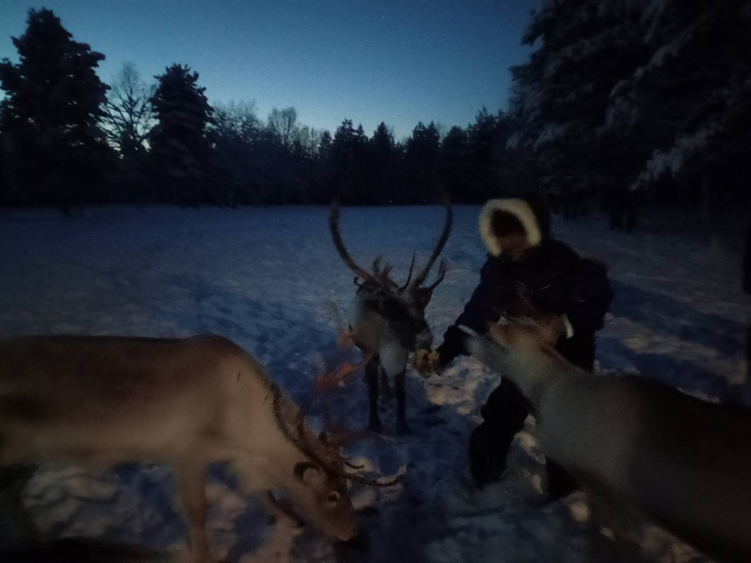 - 餌をやる時は腕を伸ばす。(曲げると近づいてきたトナカイの角が当たります)
