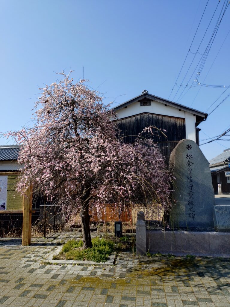 きれいな梅の木につられて見てみると、立派な碑がありました。この松倉豊後守重政氏は、江戸時代に二見城主になった人で、新町の礎を築き、人々に慕われたそうです。すぐそばに新町松倉公園もあるのですが、そこの桜はかなり立派なもので、春になると訪れる人が絶えません。