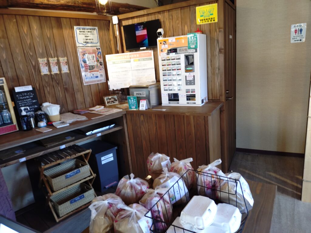 無人販売所になっていて、奥の券売機で購入したい商品のチケットを買います。現金とペイペイが使えます。ただ、1000円札と500円玉は使えなかったです…(新札対応していない?)券売機ではなく、隣の缶に現金を入れることも可能ですが、お釣りは出ません。(当たり前か…)