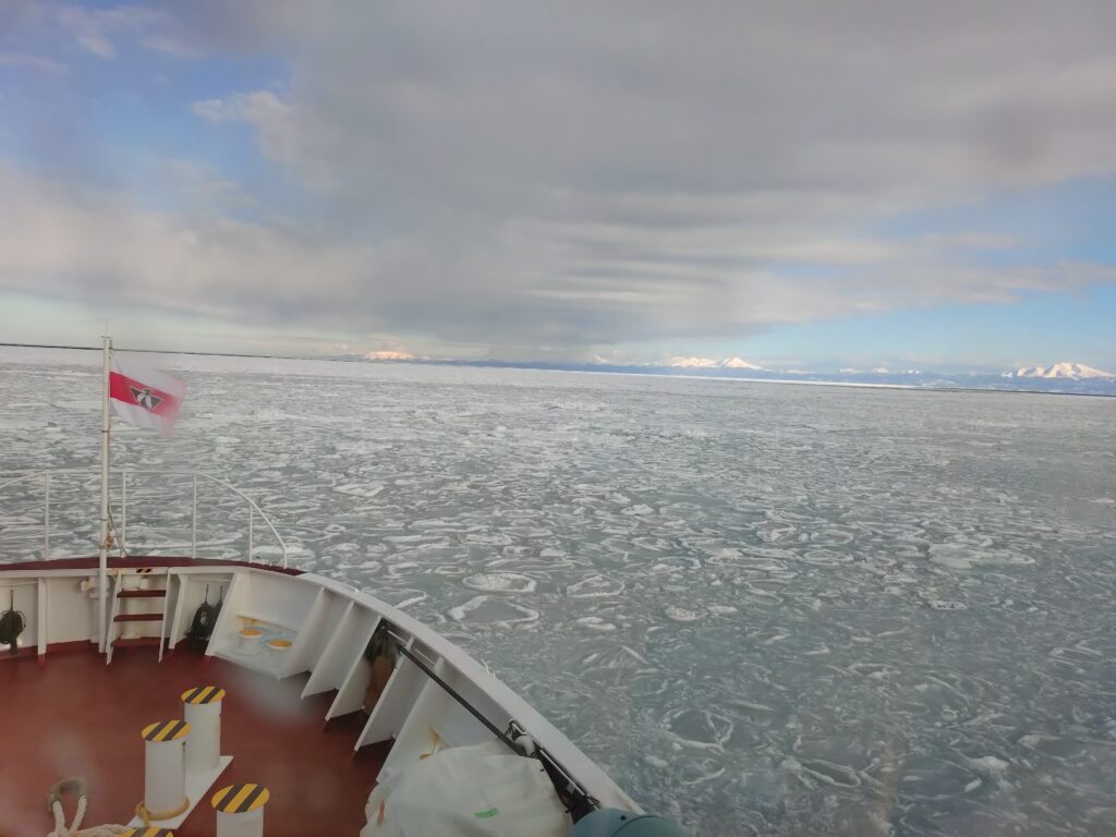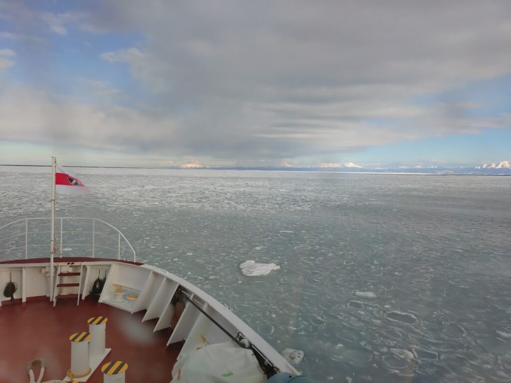 今回のメインです。予約した時は、「この時期は、昨年は流氷はありませんでしたが…」と言われましたが、少しでも見られたらいいかな、と思って行くことにしました。