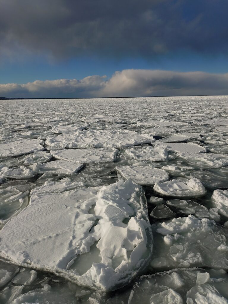 ところが…夜に雪と暴風!一夜明けると、流氷は海上沖に流されていました(^_^;)…流氷は来たり離れたりするらしいです…