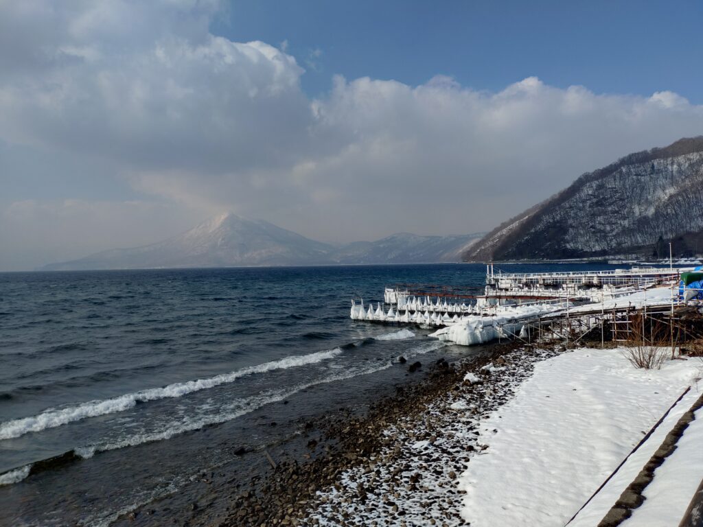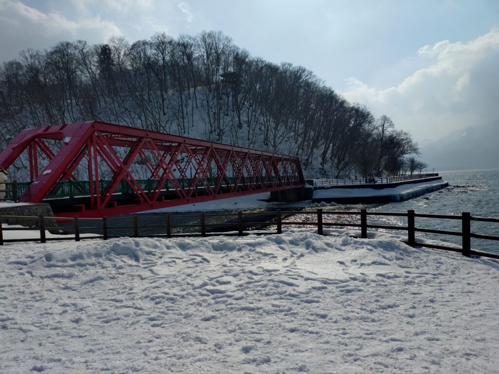北海道の南の方にあるし、大きく流れもあるためか凍っていません、凍っている湖ばかり見ていたので、逆に新鮮です。