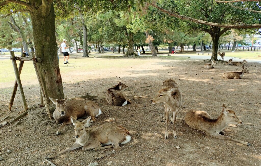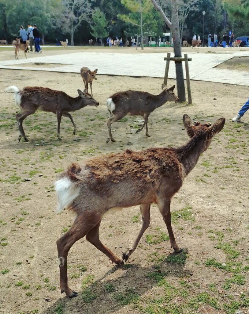 外国人が行列を作っている列があって、何を売っているのかと見たら鹿せんべいでした。お店の方が2人がかりで忙しそうに売っていました。こんなに鹿せんべいが売れているのに、まだまだ足りないらしく、鹿たちは鹿せんべいを持っている人を追いかけ回していました。