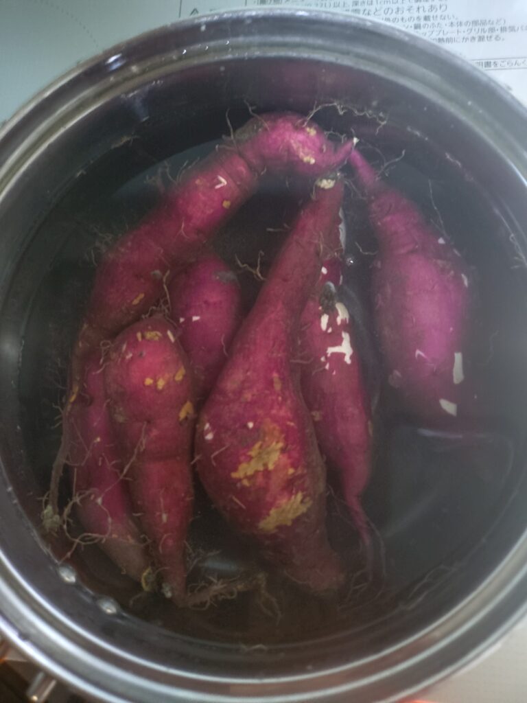 さつまいもを皮付きのまま水から湯がきます。竹串をさして通ったら、出来上がりです。