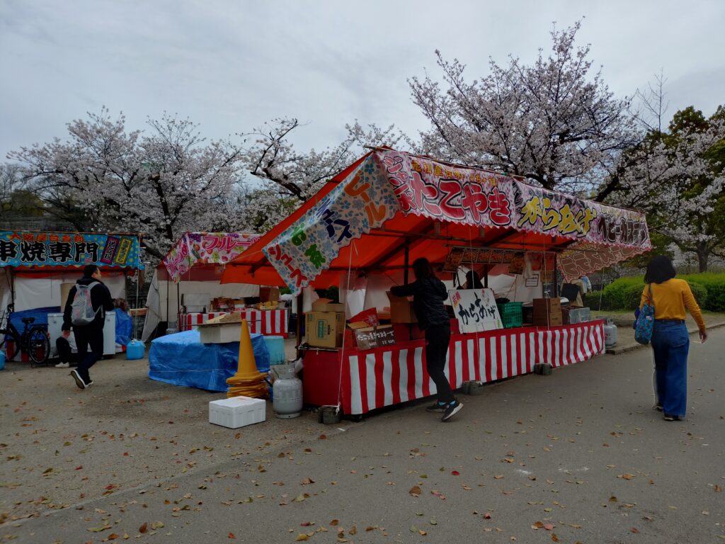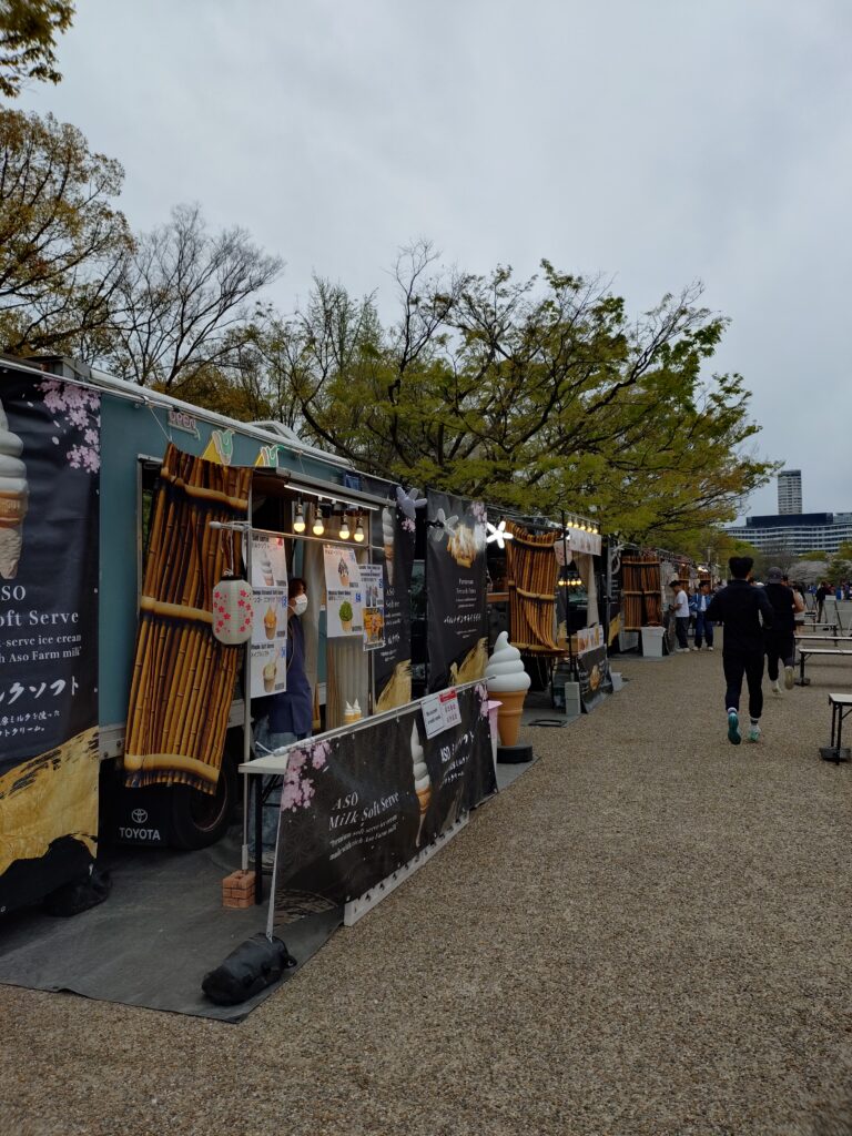 駅から歩いて、まず見えるのがたこ焼きなどの出店。もっと歩いていくと大きめのおしゃれなキッチンカーがあります。お値段は少し高めですが、外国人は好きかもしれません。