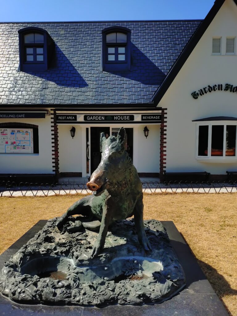 庭にいる猪の鼻を撫ぜると幸せが訪れるそうです。鼻がはげていました。もちろん撫ぜました!